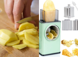 Il suffit de placer le légume dans l’ouverture, de tourner la manivelle, et le produit sort tranché, râpé ou émincé selon la lame utilisée.